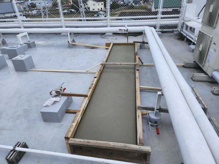 屋上コンクリート基礎工事by suda施工事例 4階建てビルの屋上に消火設備を設置するため基礎コンクリートを打ちました。設置には固定用のボルトが必要です。しかし、建物の床面に直接アンカーボルトを打ち込むと構造体の強度に影響する場合があります。このため基礎を設けてその上に設備を固定します。 タグ:基礎工事