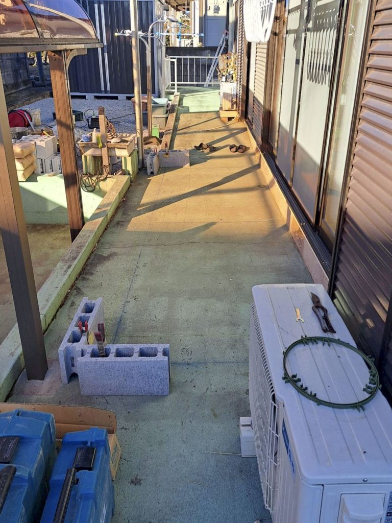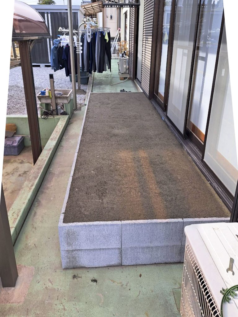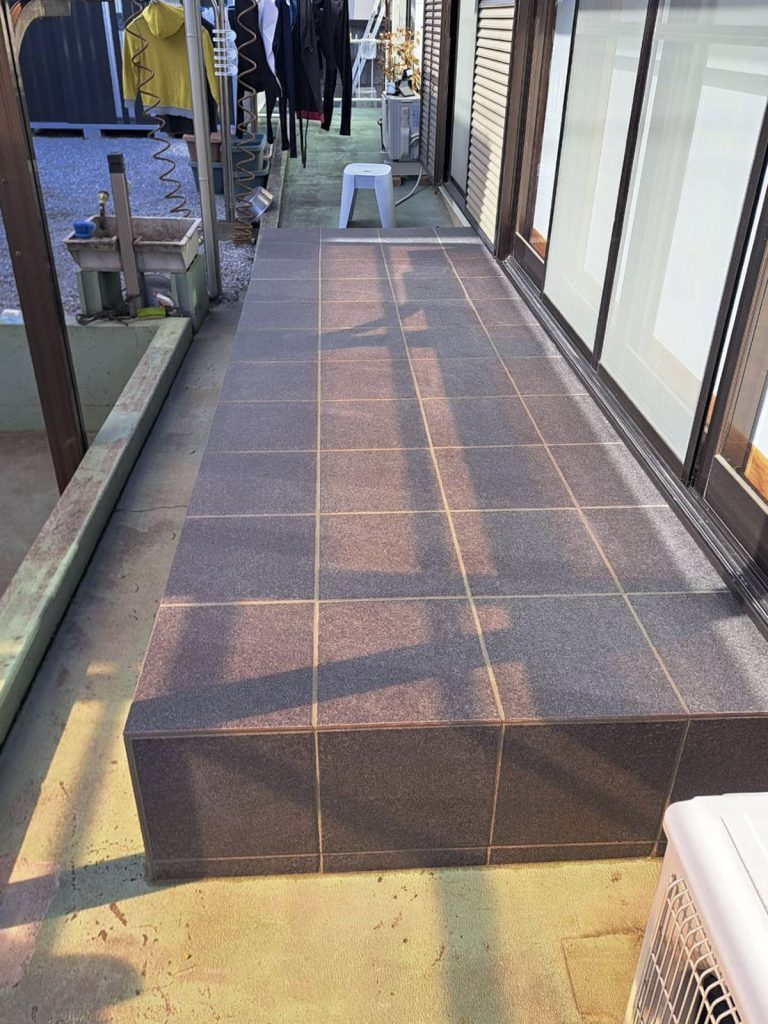 お施主様は掃き出し窓から庭へ出る際の大きな段差により、出入りや洗濯物を干すときに不便を感じていらっしゃいました。そこで窓の高さに合わせてコンクリートとタイルで仕上げたポーチを新設。木製デッキと比べ強度や耐久性に優れており、長く安心してお使いいただます。
