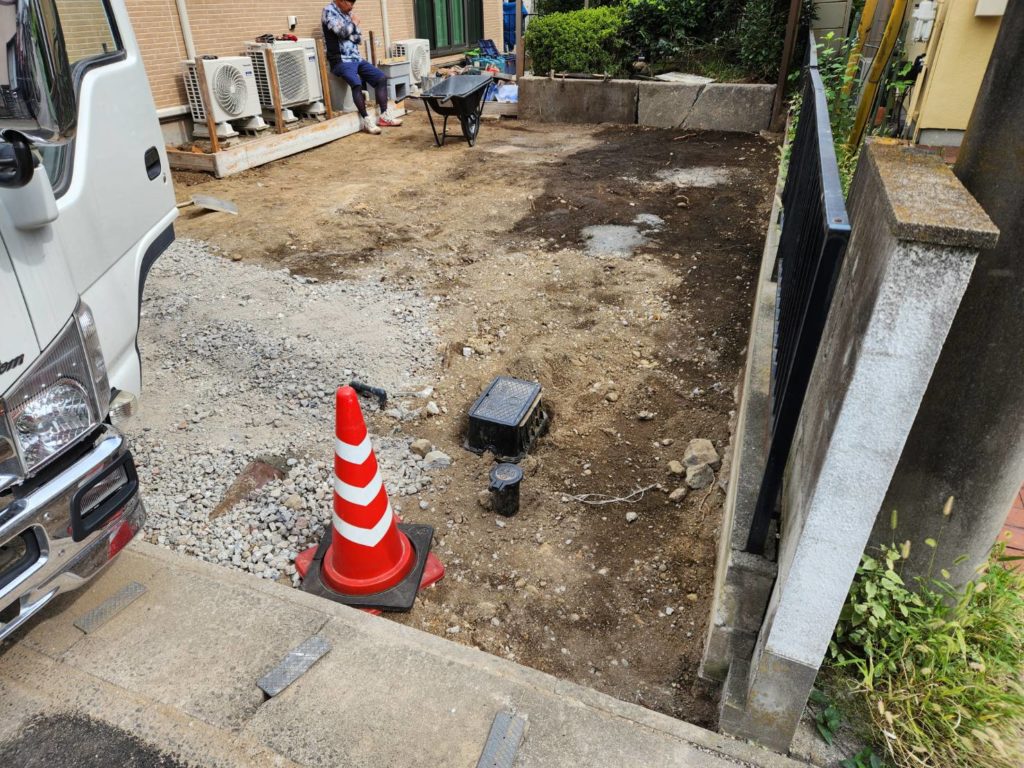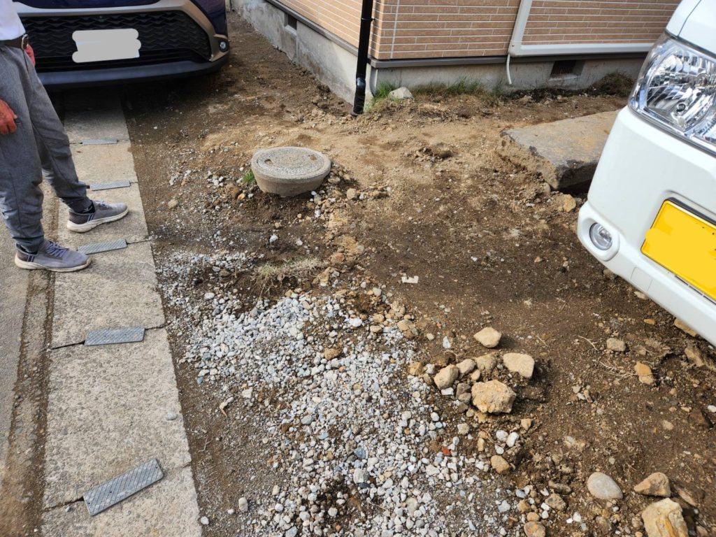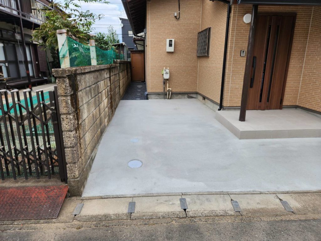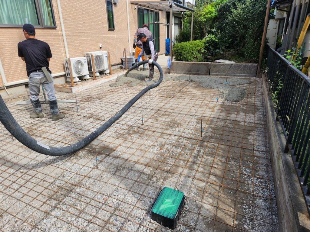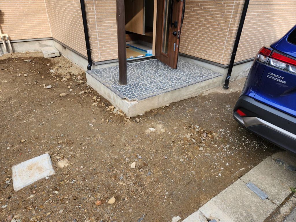 土の庭をコンクリート舗装にするメリットは、管理のしやすさと使い勝手の向上にあります。今回は庭全体をコンクリート舗装にし、さらに玄関ポーチを石貼りからタイル貼りへリフォームしました。