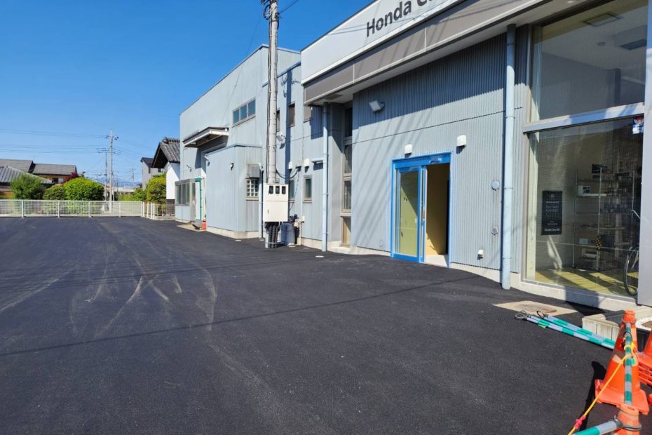 カーディーラー様の建物北側に、新たに自動ドアの開口部を設置しました。出入り口の利便性が向上し、導線がスムーズになりました。風除室も作り外気の影響を抑えて快適な室内環境を実現しました。 裏側駐車場への開口部を作ります。